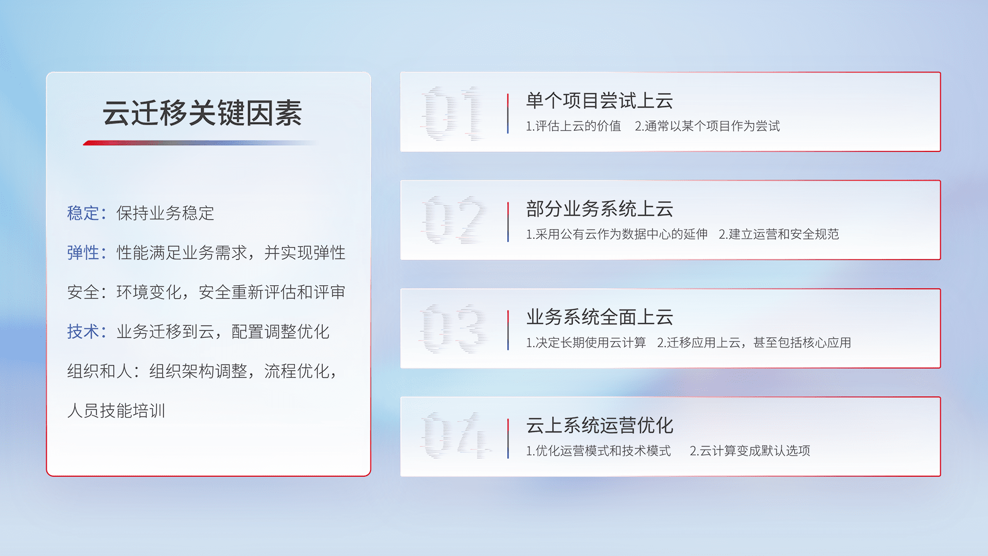 结合实际业务,,从规划设计、、、、云平台选型、、、云原生改造、、数据迁移、、、集成交付,,,迁移全过程为客户识别最佳上云路径,,,做好风险识别管理,,设计网络架构、、、、身份权限、、安全审计合规、、、、操作审计、、、日志审计、、、监控告警策略、、、、多站点容灾设计等,,,对云上基础设施进行整体规划,,,提升IT治理水平,,,,以满足弹性、、高可用、、、、高性能的需求。。。。