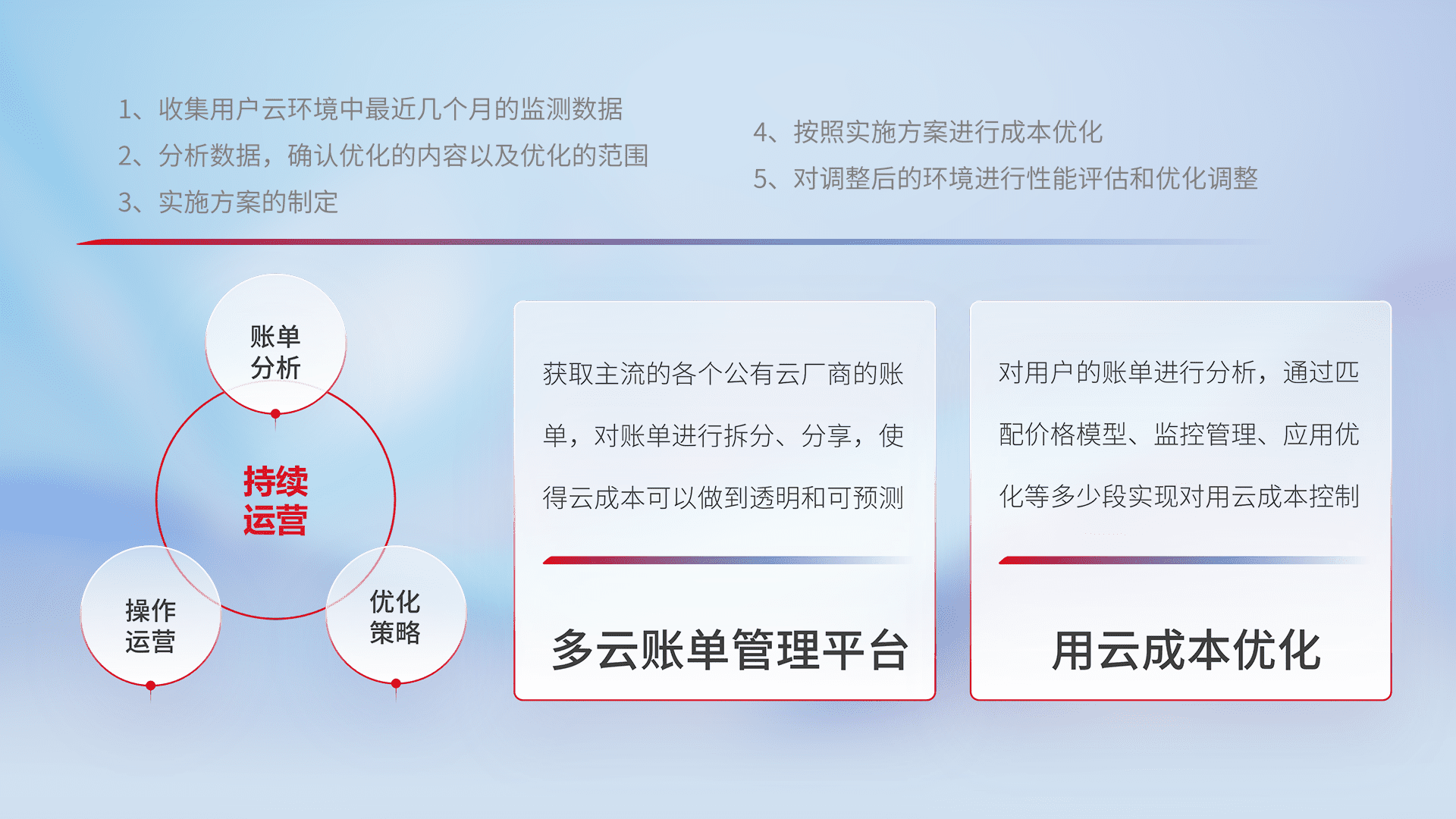 通过灵活运用多种自动化迁移工具,,,,帮助企业用户实现业务和数据高效 、、、稳定的上云迁移和云上迁移,,采用自研多云纳管平台,,,以中立管理模式,,,解决多组织、、、多云、、多运维厂商的复杂关系的管理,,,保证多云平台资源配置的一致性,,,实时掌控云资源运行数据,,,运用智能化工具分析云资源多云平台的管理服务,,,,透明化管理成本支出,,用云成本可预测、、、、用云费用可优化、、、、云资源配额有据可依。。。
