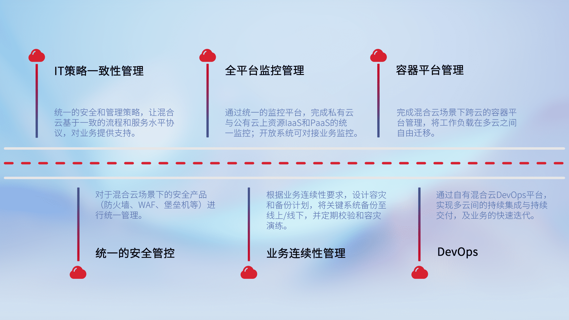 通过多云纳管,,,,以统一的资源数据模型把客户的云资源进行抽象和封装,,进而实现对多云资源的统一操作,,保障云资源管理的可靠性、、稳定性与可用性。。量身定制化运维内容,,配置、、、、开发运维、、补丁管理、、、备份、、、监控、、、、认证和访问管理、、、审计和日常巡检等,,,保障在用云过程中的可靠度,,,,稳定度以及高可用率。。