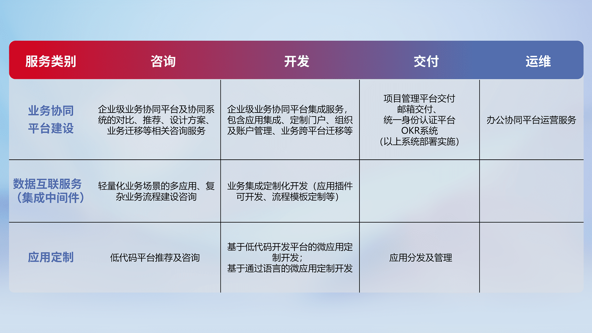 针对钉钉、、、企微、、、、IDaas等平台级产品提供产品的规划、、方案、、交付、、定制化开发等服务,,,,实现如统一协同办公、、智能客户服务、、、混合会议管理、、、、智能数据查询、、、等业务场景,,实现数字化转型。。。